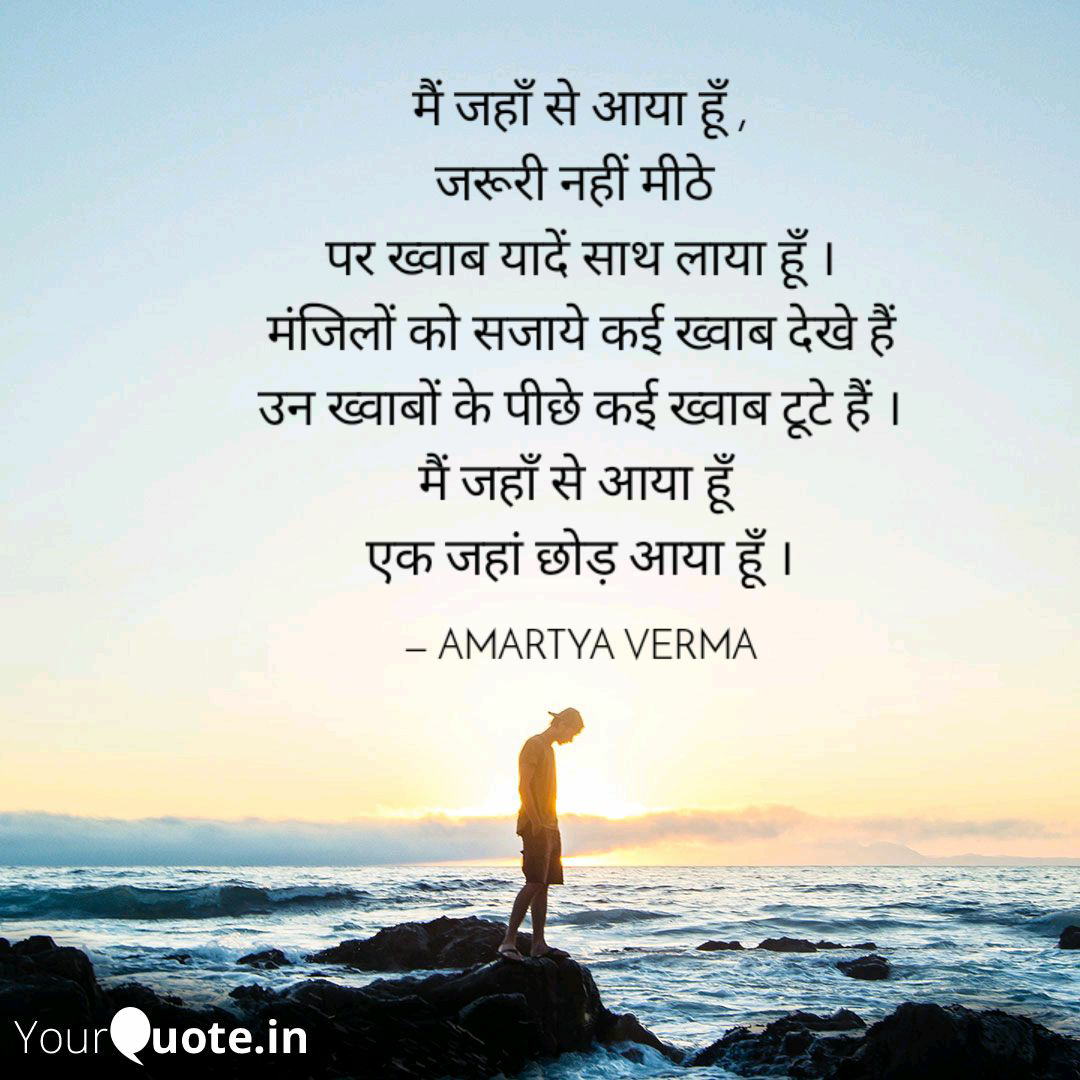 ख्वाब Posted on 20th Oct 2020 by AwesomeArt मैं जहाँ से आया हूँ , जरूरी नहीं मीठे पर कई ख्वाब साथ लाया हूँ । मंजिलों को सजाये कई ख्वाब देखे हैं उन ख्वाबों के पीछे कई ख्वाब टूटे हैं । मैं जहाँ से आया हूँ एक जहां छोड़ आया हूँ । Share this: Click to share on X (Opens in new window) X Click to share on Facebook (Opens in new window) Facebook Click to share on Pinterest (Opens in new window) Pinterest Click to share on Telegram (Opens in new window) Telegram Click to share on WhatsApp (Opens in new window) WhatsApp Click to email a link to a friend (Opens in new window) Email More Click to share on Reddit (Opens in new window) Reddit Click to share on Tumblr (Opens in new window) Tumblr Like Loading... Related Published by AwesomeArt Digital Organization View all posts by AwesomeArt